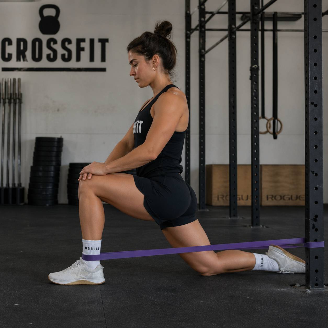Step into a lunge so the band pulls the talus posteriorly, then drive your knee forward over your toes for ten to fifteen repetitions.